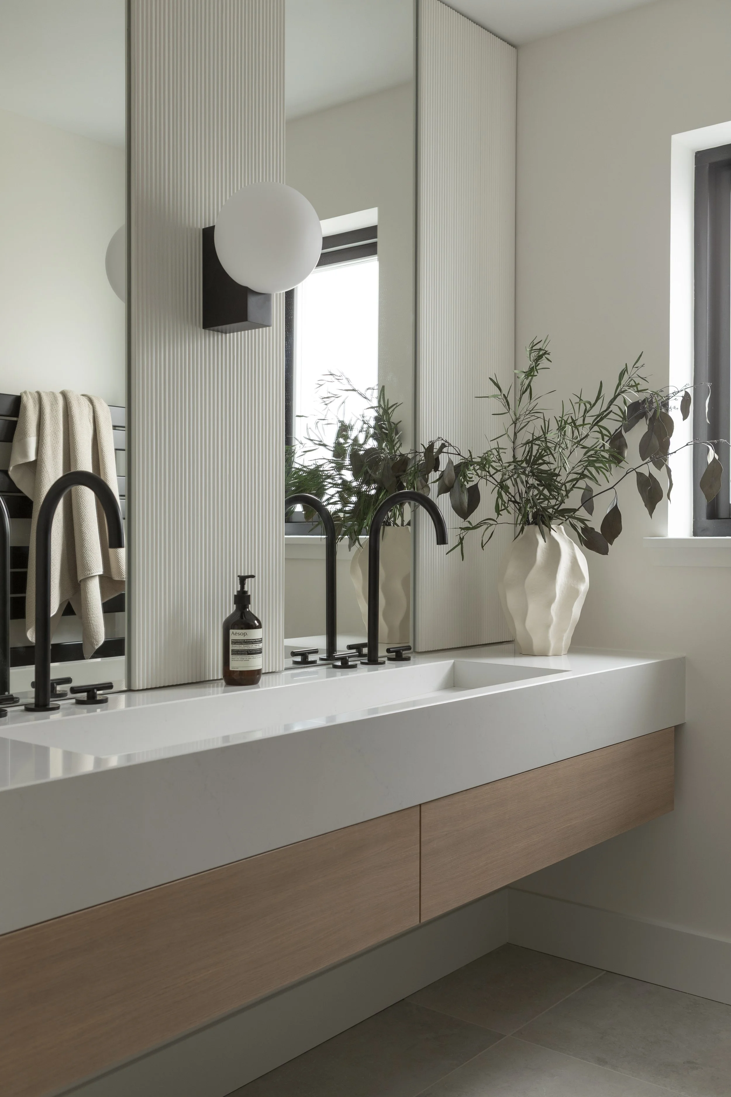 With panoramic countryside views framing the home, our approach was inspired by the landscape outside. Natural materials - stone, marble, and linen - set a calming tone and brought a tactile warmth to the interior. Large, open windows allowed light to flood the spaces, and the palette remained neutral and soft, with carefully considered deeper accents to anchor the rooms and provide a sense of comfort. Downstairs, a darker theme emerged, with a black kitchen, utility room, and downstairs shower featuring textured black tiles. Bespoke cabinetry maintained clean lines while maximising storage and functionality, proving that practical solutions can also be striking.