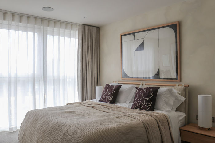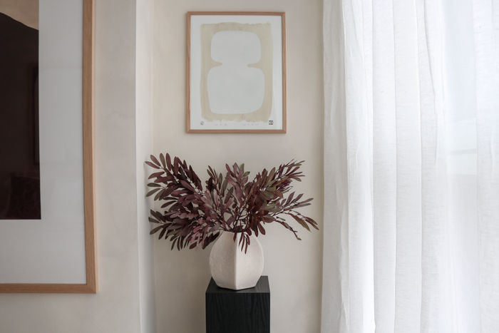 This "moody Japandi" room masterfully combines deep hues with a neutral scheme to create a dramatic yet serene atmosphere. The walls, coated in lime wash paint, add a rich texture that enhances the room's depth and character. Dark, earthy tones interplay with natural textures and woods, creating a harmonious balance between drama and tranquility. The overall effect is a sophisticated, cosy environment that feels both grounded and elegant, perfect for relaxation.