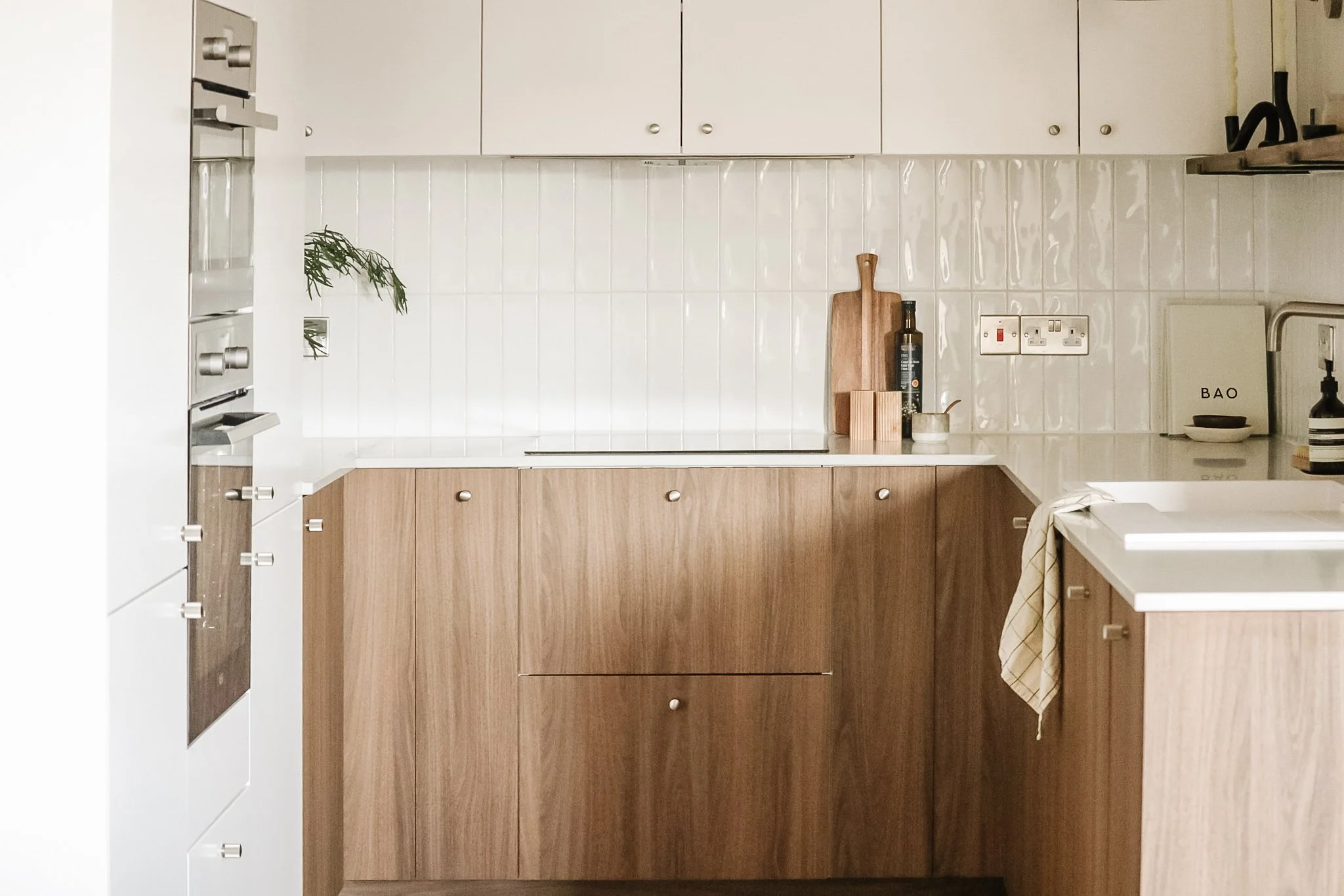 Located in a 2000s flat in Leith, this kitchen was redesigned to feel bright, airy, and effortlessly functional. Working with a U-shaped layout, the Studio Heim team maximised storage while creating a sense of space in a kitchen that once felt dark and disconnected from natural light. Dark wood cabinetry is balanced with white surfaces and textured gloss tiles, reflecting light around the room, while mid-century-inspired wall lights and stainless steel details add personality. Every design choice enhances usability without compromising style, proving that a compact kitchen can be both practical and beautiful.